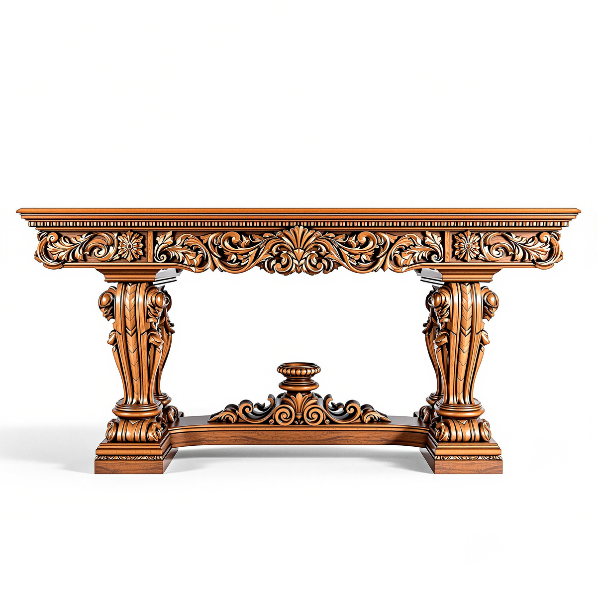 Стол «Капитал» в парадной классике — выразительный образец художественной резьбы и столярного мастерства. В основе конструкции используется массив бука, идеально подходящий для сложных резных элементов благодаря плотности и однородной структуре древесины. Богато декорированный подстольный пояс с растительным орнаментом, массивные резные опоры и фигурная связка основания формируют эффектную архитектурную композицию.
