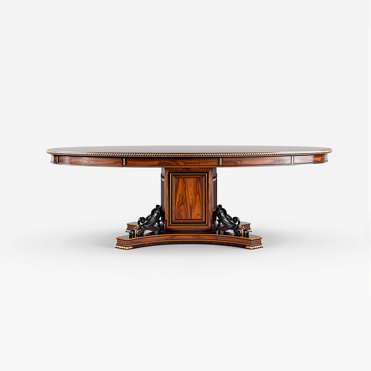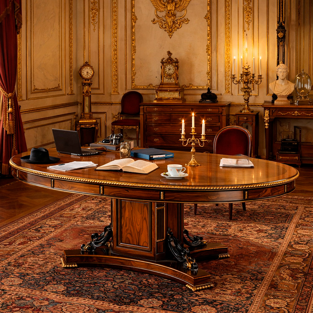 Стол «Вудмаст» представительского уровня — гармония архитектурной строгости и утончённой декоративности. В основе изделия используется массив ореха, отличающийся выразительной текстурой с глубокой, контрастной структурой волокон и благородным тёплым оттенком. Монументальная центральная опора с художественно оформленным основанием придаёт конструкции устойчивость и статусность, а изящный профиль столешницы с декоративным кантом подчеркивает премиальный характер модели.
