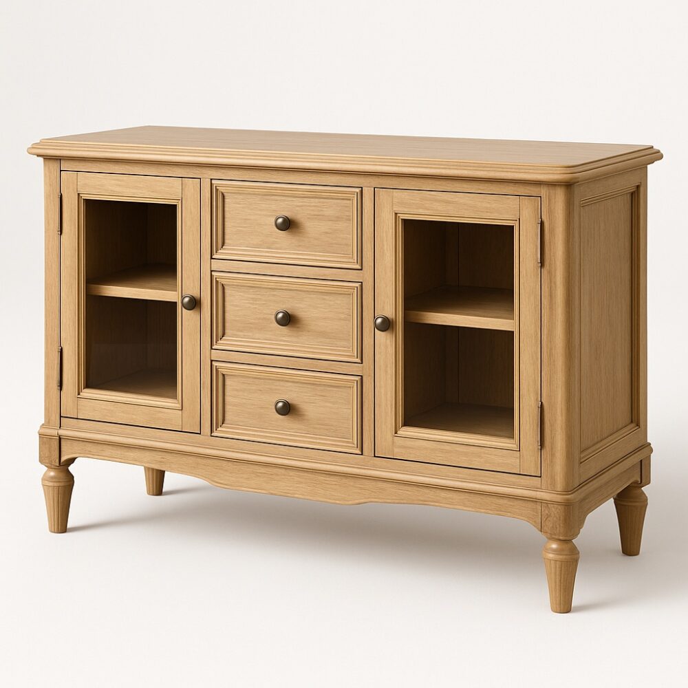 Тумба «Верде» с витринными секциями в современном неоклассическом стиле сочетает сдержанную элегантность форм и функциональную продуманность. Симметричная композиция с центральным блоком ящиков и боковыми нишами придаёт предмету визуальный баланс, а мягко скруглённые кромки и изящные ножки добавляют интерьеру лёгкость и благородство.