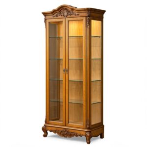 Витрина «Грандецца» выполнена из массива ореха и воплощает благородную классику с выразительным декоративным характером. Тёплый, насыщенный оттенок древесины подчёркивает природную текстуру ореха, а изысканная ручная резьба на карнизе, цоколе и опорах придаёт изделию статусность и художественную глубину. Стеклянные фасады и боковины создают эффект лёгкости и позволяют эффектно демонстрировать предметы интерьера, фарфор или коллекции.