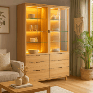Эта витрина станет акцентом в интерьерах в стилях минимализм, скандинавский и современная классика, внося в пространство свет, тепло и природную элегантность.