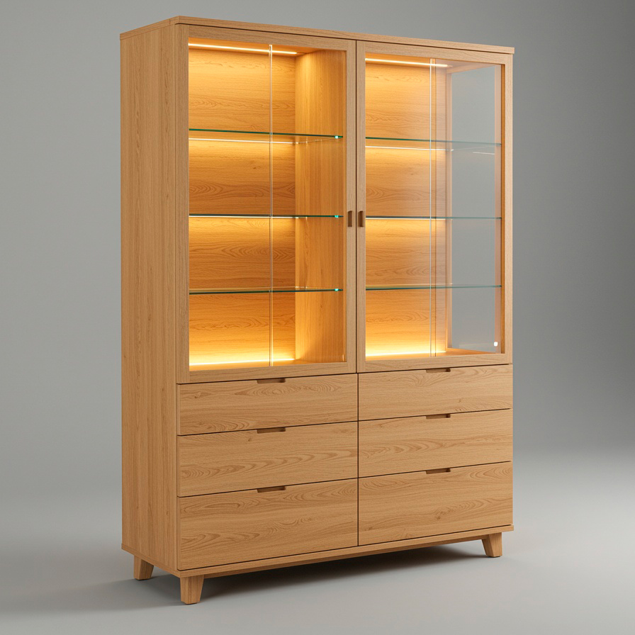 Мягкое внутреннее LED-освещение с тёплым спектром создаёт эффект галерейной подсветки, позволяя выгодно представить коллекционные предметы, книги или декор. Нижние закрытые секции обеспечивают практичное хранение без нарушения визуального баланса.