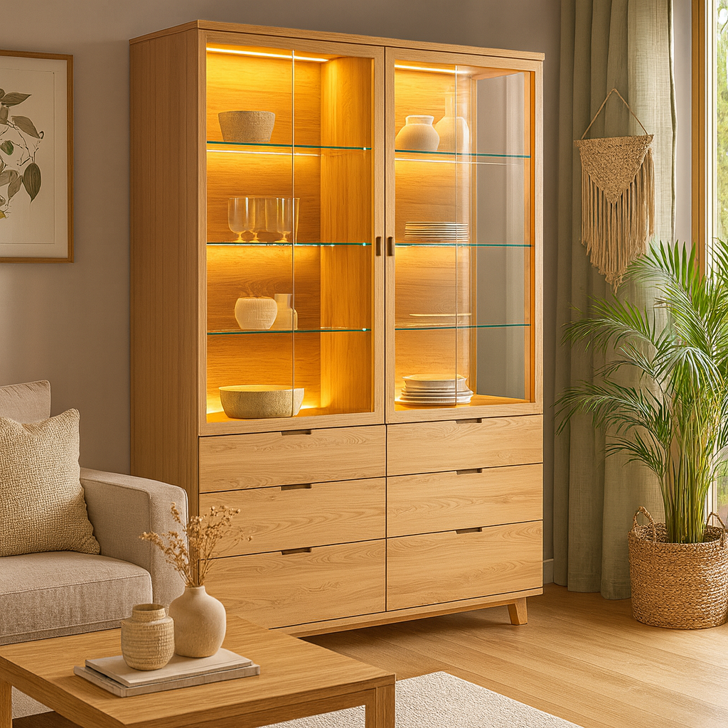 Эта витрина станет идеальным акцентом в интерьерах в стилях современная классика, скандинавский, экологичный минимализм и современный уют, наполняя дом светом и естественным теплом.