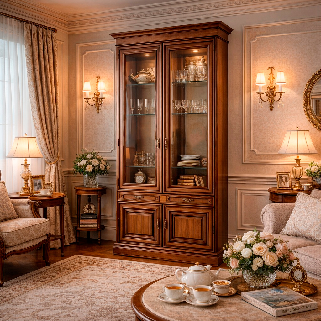 Витрина «Нобилис» гармонично вписывается в интерьеры классика, неоклассика, современная классика, арт-деко, интерьер загородного дома или элегантной городской гостиной. Идеально подойдёт для гостиной, столовой, кабинета или домашней библиотеки, становясь выразительным акцентом и одновременно функциональным элементом пространства.
