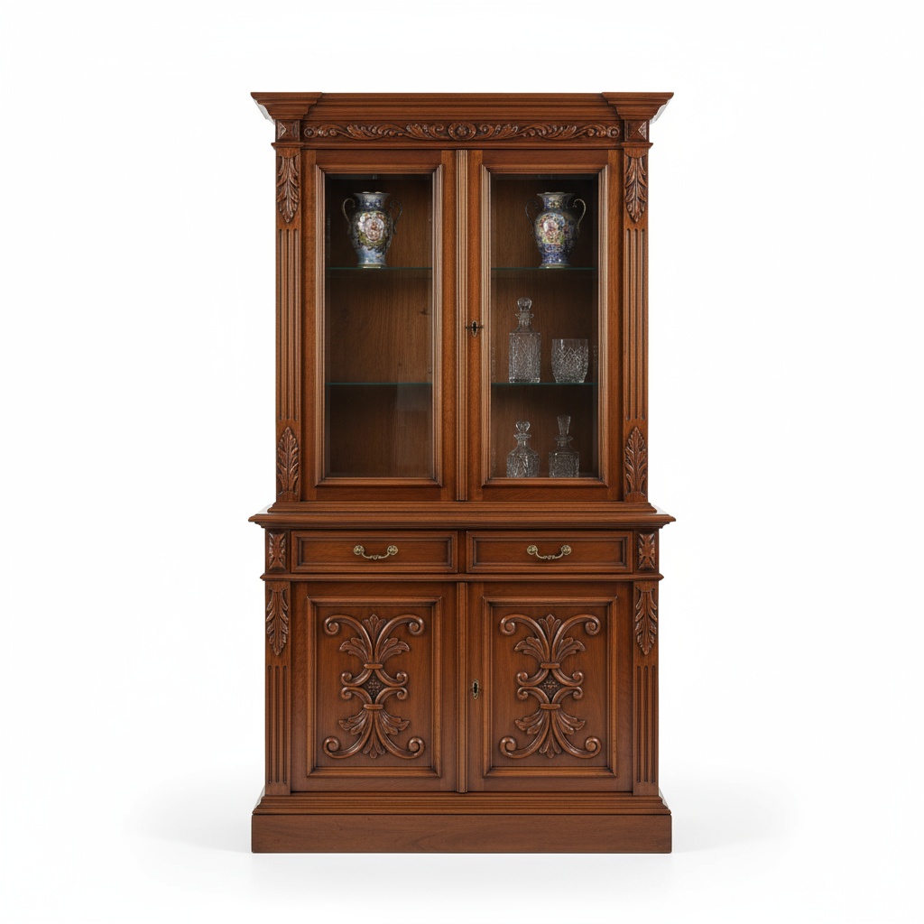 Витрина «Орион» из массива ореха — статусный предмет мебели с выразительным классическим характером и богатой художественной резьбой. Высокие стеклянные фасады подчёркивают изящество экспозиции, позволяя эффектно разместить фарфор, хрусталь или коллекционные предметы, а нижняя закрытая секция обеспечивает удобное и аккуратное хранение. Плавные линии, фигурный цоколь и декоративный карниз формируют цельный, благородный образ.