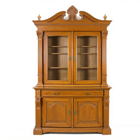Корпус и фасады собраны из ценных пород древесины и облицованы шпоном ореха экстра-класса с идеально подобранным узором. Выразительные пилястры с каннелюрами, филёнчатые дверцы и архитектурный фронтон формируют строгий дворцовый силуэт, подчеркивая статусность и мастерство исполнения.