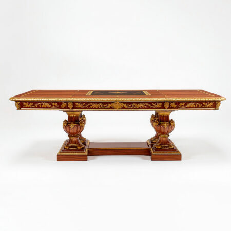 Роскошная резьба по царге и капителям опор отсылает к традициям дворцовой мебели и подчёркивает статус изделия. Конструкция усилена надёжными соединениями с применением фурнитуры Blum, обеспечивающей долговечность, точную геометрию и устойчивость в ежедневной эксплуатации. Поверхность покрыта экологичными итальянскими лакокрасочными материалами, которые защищают древесину и подчёркивают её природный рельеф и цвет.