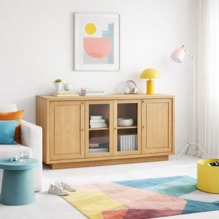 Технические особенности: конструкция выполнена с рамочными фасадами и вставками из шпона, центральная часть оснащена открытыми полками для декора или посуды, опоры выполнены из массива бука, а все соединения скрыты для идеальной визуальной чистоты.